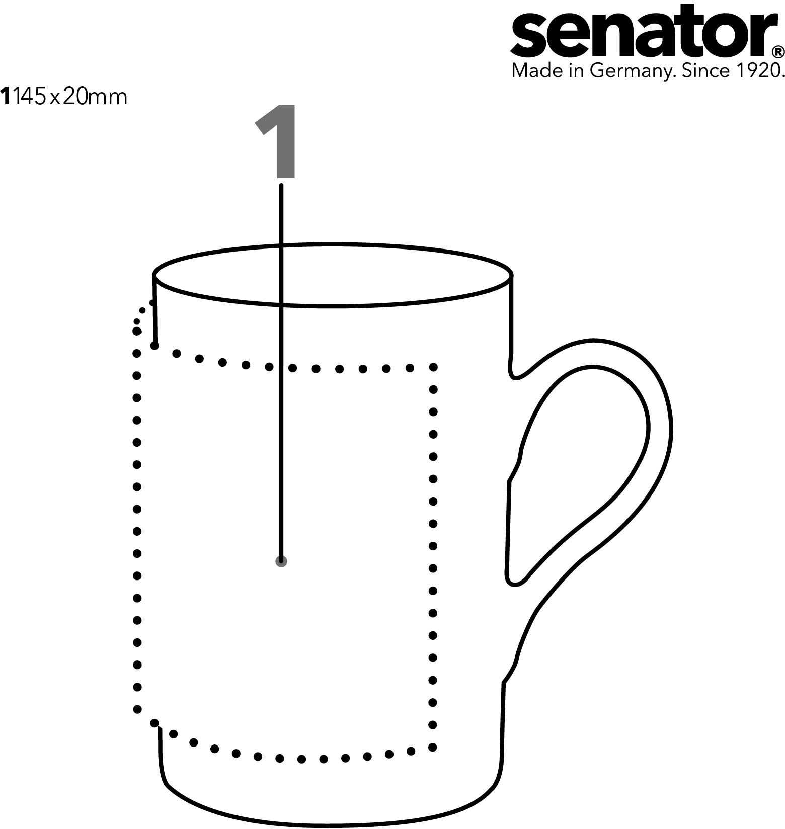 Ein besonderer Vorteil der Senator Tasse Prime ist die großzügige Druckfläche von 145 x 70 mm, die es ermöglicht, Ihr Logo oder Design detailgetreu und in hoher Qualität abzubilden. Mit einer Mindestbestellmenge von 36 Stück eignet sich diese Option sowohl für kleine als auch für größere Bestellungen.